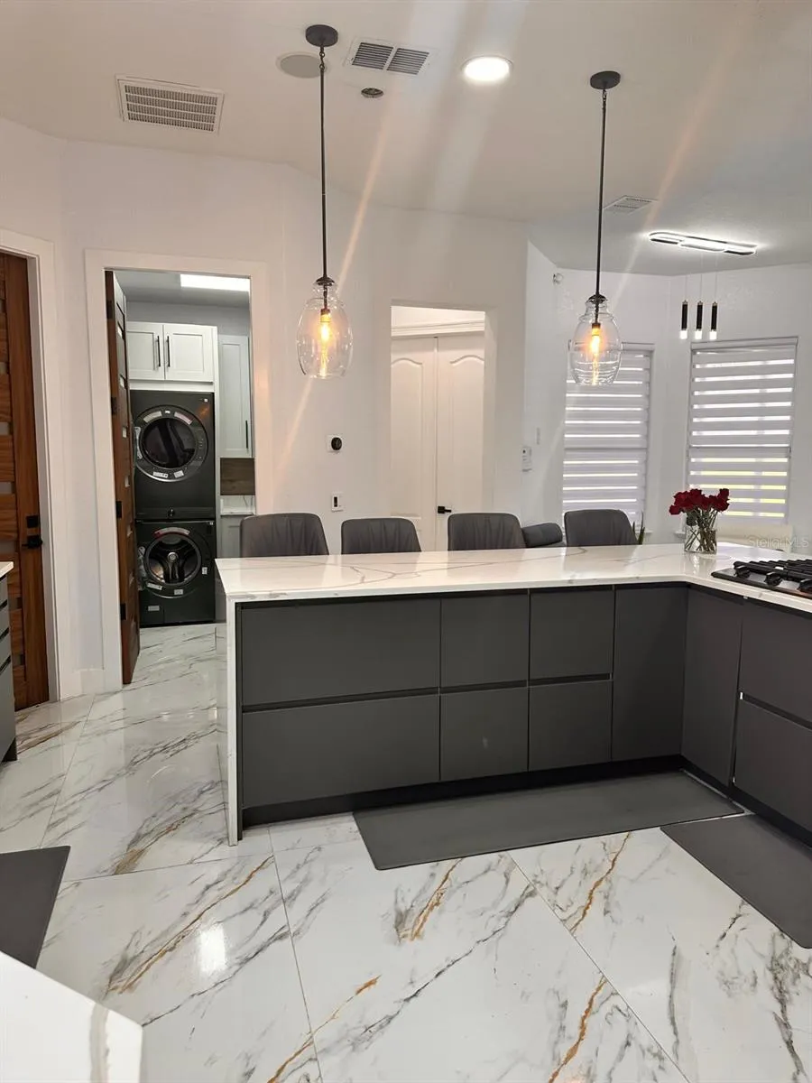 The chef’s dream kitchen features quartz countertops, modern cabinetry, ample storage, a walk-in pantry with an extra refrigerator, smart Samsung appliances, a gas stove (with available electric hookup), and a full-house water filtration system with additional UV filters.\r\n