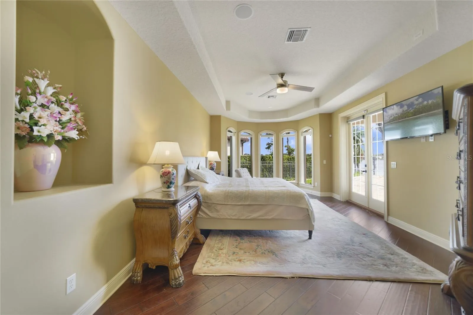 The primary suite is expansive, featuring a private sitting area with panoramic bay windows that showcase the lake. The spa-inspired bath includes a double-entry walk-through shower, whirlpool tub, and dual vanities.\r\n