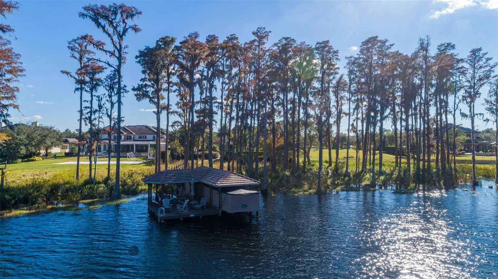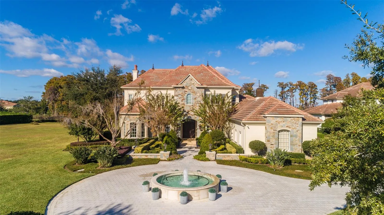 Outdoors, resort style lush landscaping and mature trees provide both beauty and privacy. Beyond the pool, winding walkways lead past fountains and gardens to a secluded fire pit set alongside a gentle stream. A charming bridge across the stream leads to the private dock on Lake Tibet Butler. \r\n