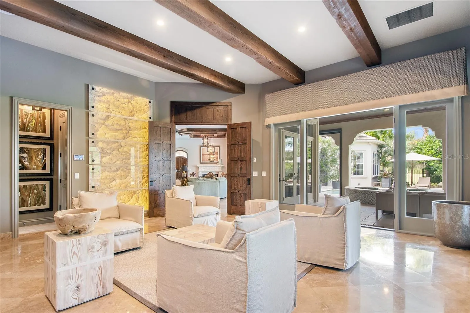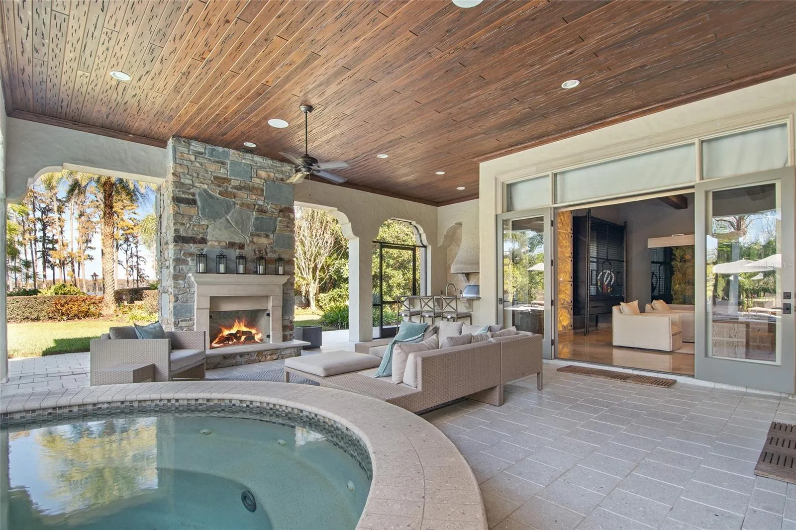 Beyond the grand entry, the heart of the home centers on a gourmet kitchen with professional-grade appliances, stone counters, custom cabinetry and a large island opening to the dining area and large family room. An adjacent game room with a 2,000-gallon saltwater aquarium—once featured in The Wall Street Journal—provides additional entertaining space. All main living areas connect through French doors to the resort-style patio with spa, fireplace, and summer kitchen—all enclosed by motorized screens.\r\n