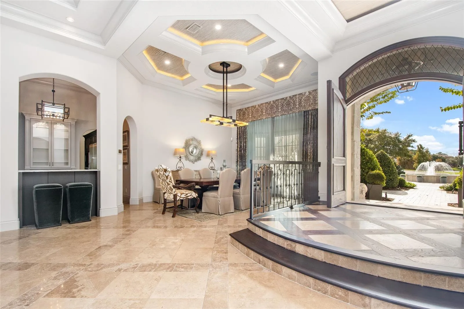 The elevated foyer overlooks the formal dining and living areas—an elegant introduction defined by architectural ceilings, refined lighting, and timeless travertine floors. \r\n