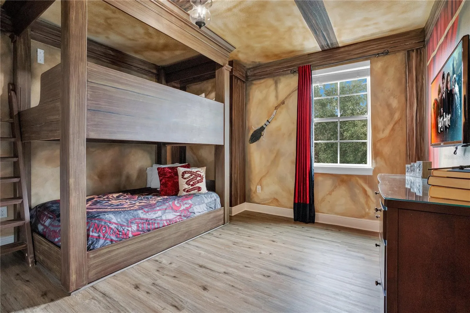 FRESHLY PAINTED INTERIORS AND EXTERIORS (Oct2025) create a bright, refreshed atmosphere complemented by NEW FURNISHINGS, NEWLY EPOXIED GARAGE FLOOR, & FRESHLY CLEANED TILE. With its FULLY FURNISHED, TURN-KEY DESIGN, this home is ready for immediate enjoyment or effortless short-term rental success. Designed to host large gatherings, the floor plan is impressive & functional. THREE PRIMARY SUITES; two located downstairs & one upstairs, offer luxurious retreats while ENSUITE SPA-LIKE baths provide ultimate privacy. Many with dual sinks, garden tubs, & natural light. The OPEN-CONCEPT great room & dining area flow into the kitchen with GRANITE COUNTERS, 42-inch shaker style cabinetry, coffee bar, DUAL STAINLESS-STEEL REFRIGERATORS and DISHWASHERS, and Breakfast Bar. Dual Laundry Rooms upstairs & down offer further convenience. Upstairs, the experience grows even more enchanting. IMMERSIVE THEMED ROOMS bring childhood dreams to life; HARRY POTTER'S CHAMBER OF SECRETS, ELSA'S ENCHANTED LOFT, and the SUPERHERO SANCTUARY are professionally designed with 360-degree murals and custom loftstyle beds. The STAR WARS SCREENING ROOM offers a cinematic escape with projector, surround sound, and reclining leather sectional. A nearby ENTERTAINMENT LOFT with foosball and TV adds extra fun. Floor to ceiling sliding doors open to your PRIVATE OUTDOOR OASIS featuring large covered lanai, spacious paver patio and lawn, HEATED POOL AND SPA surrounded by tropical landscaping, fenced yard, NO REAR NEIGHBORS, and SERENE POND VIEWS. Whether sipping morning coffee by the pool or enjoying a sunset swim, every moment feels like a resort escape.\r\n