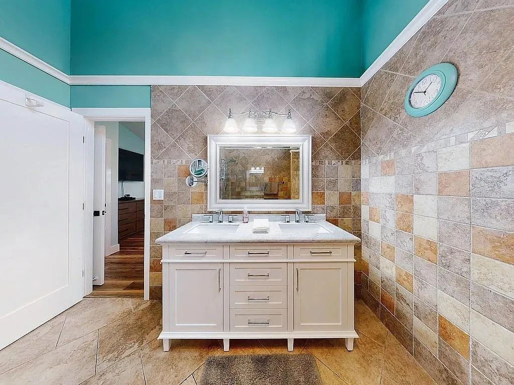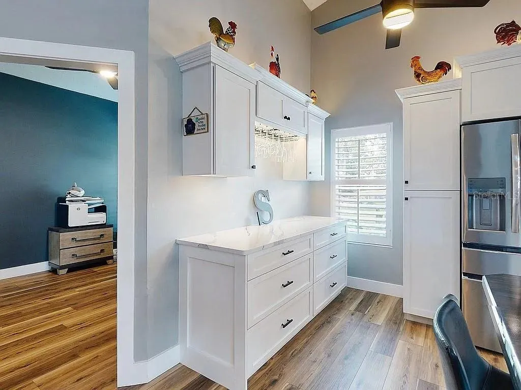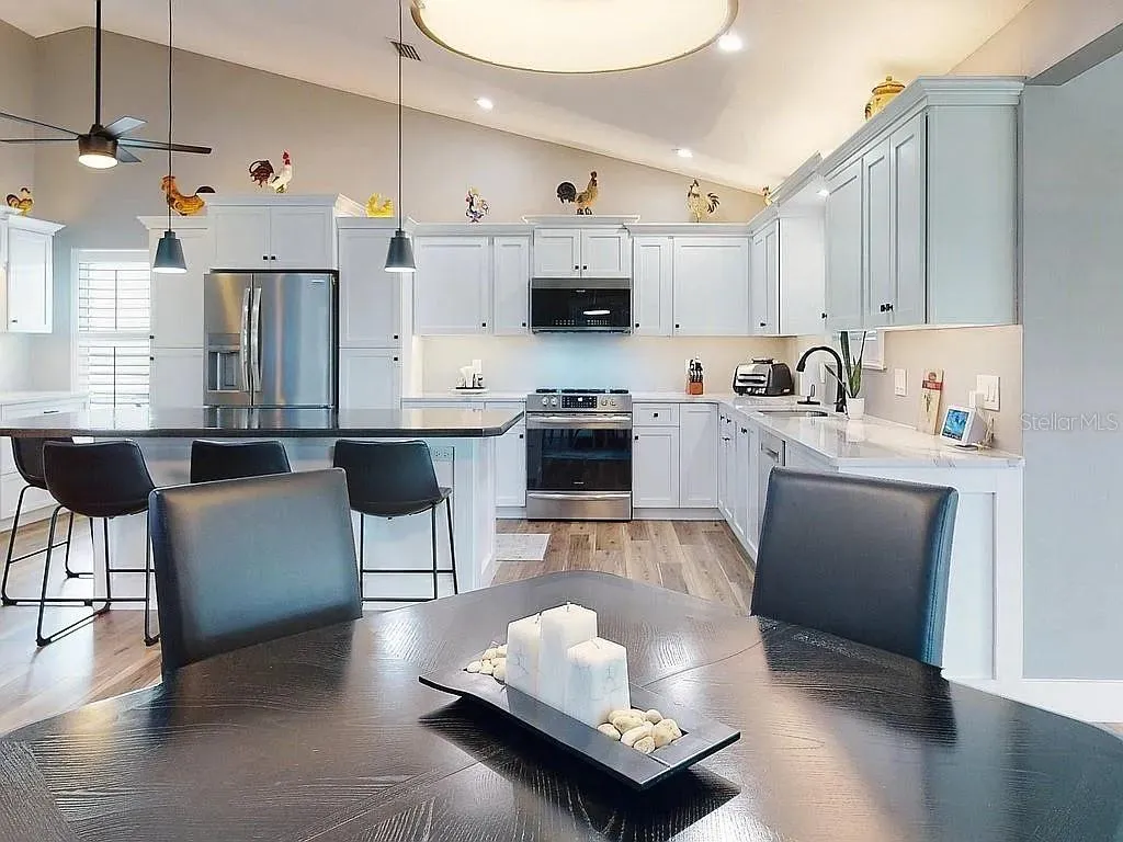 The showpiece kitchen was fully remodeled with both design and functionality in mind. It features crisp white shaker cabinetry with pull-out shelving, quartz countertops, and a striking 8x4 bamboo island that anchors the space. Enjoy a dedicated dry bar and premium stainless-steel appliances, including a Bosch dishwasher, Frigidaire Gallery oven with built-in air fryer, microwave, and a four-door refrigerator. Under- and over-cabinet LED lighting adds a sophisticated glow, creating a perfect environment for cooking and entertaining.\r\n