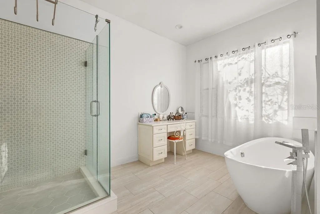 * A brand-new primary bathroom with dual vanities, oversized shower, dedicated makeup/dressing area, and a custom walk-in closet.\r\n