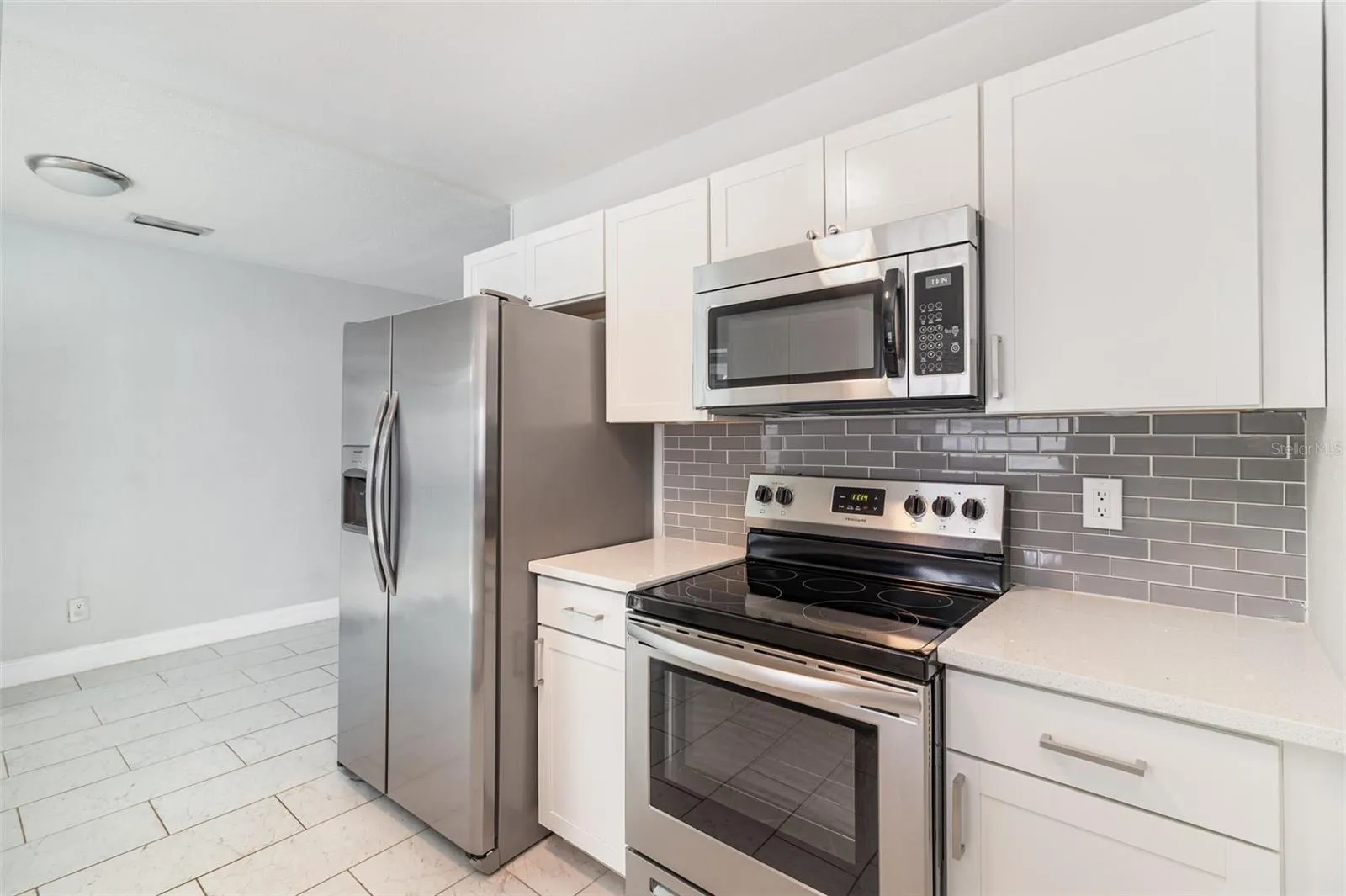 +"PublicRemarks": "Welcome to your renovated and updated East Dover Shores Pool Home! This beautiful move-in ready 4 bedroom, 2 bath pool home features an open layout that flows into a fully enclosed screened-in pool area with a newly painted deck, a tv, and a cordless sun shade--ideal for year round enjoyment. The large, fully fenced yard provides privacy and plenty of room for outdoor living. The kitchen offers beautiful modern quartz countertops, white shaker-style cabinets, subway tile backsplash, and stainless steel appliances. And right off of the kitchen is a large utility room with plenty of space for extra storage. The versatile fourth bedroom is oversized and can easily serve as a recreation room, flex space or home office and has an electric fireplace for that extra ambiance. Major updates include a 2021 roof, a high-efficiency Trane AC system with smart thermostat, fully renovated kitchen and baths, tile floors, and wood laminate flooring throughout. Conveniently located just minutes from Downtown Orlando, the Orlando International Airport, major highways, nearby parks, dining, and shopping. This home has it all, combining comfort, functionality, and an excellent central location! Book a tour today!"