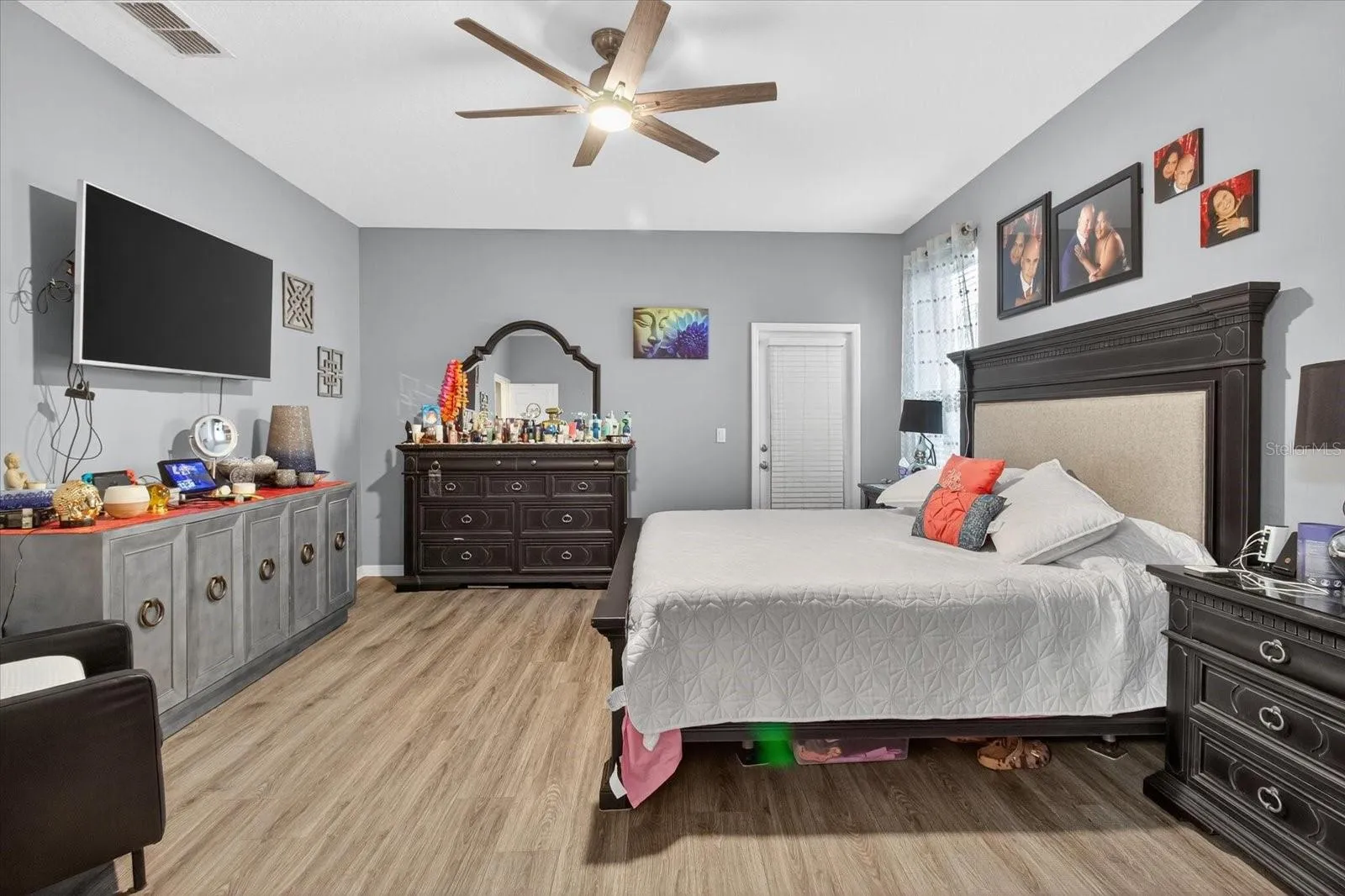 +"PublicRemarks": "Welcome to a Spacious 5-bedroom, 3.5-bath home featuring a first-floor primary suite and large closets in every room. This home offers waterproof luxury vinyl flooring throughout and a custom-built entertainment center in the loft that conveys with the sale. The kitchen includes a generous pantry and ample storage space, perfect for family gatherings and everyday living. Enjoy your private backyard with a saltwater pool. The garage is equipped with an Tesla back up battery More than half of the home for added convenience. Additionally, home features Solar panels conveyed in the sale of the home. The home will be professionally pressure washed and freshly painted on the exterior, ensuring an easy, move-in-ready experience. Located in a desirable community offering multiple amenities for residents to enjoy. Schedule your private showing today!"