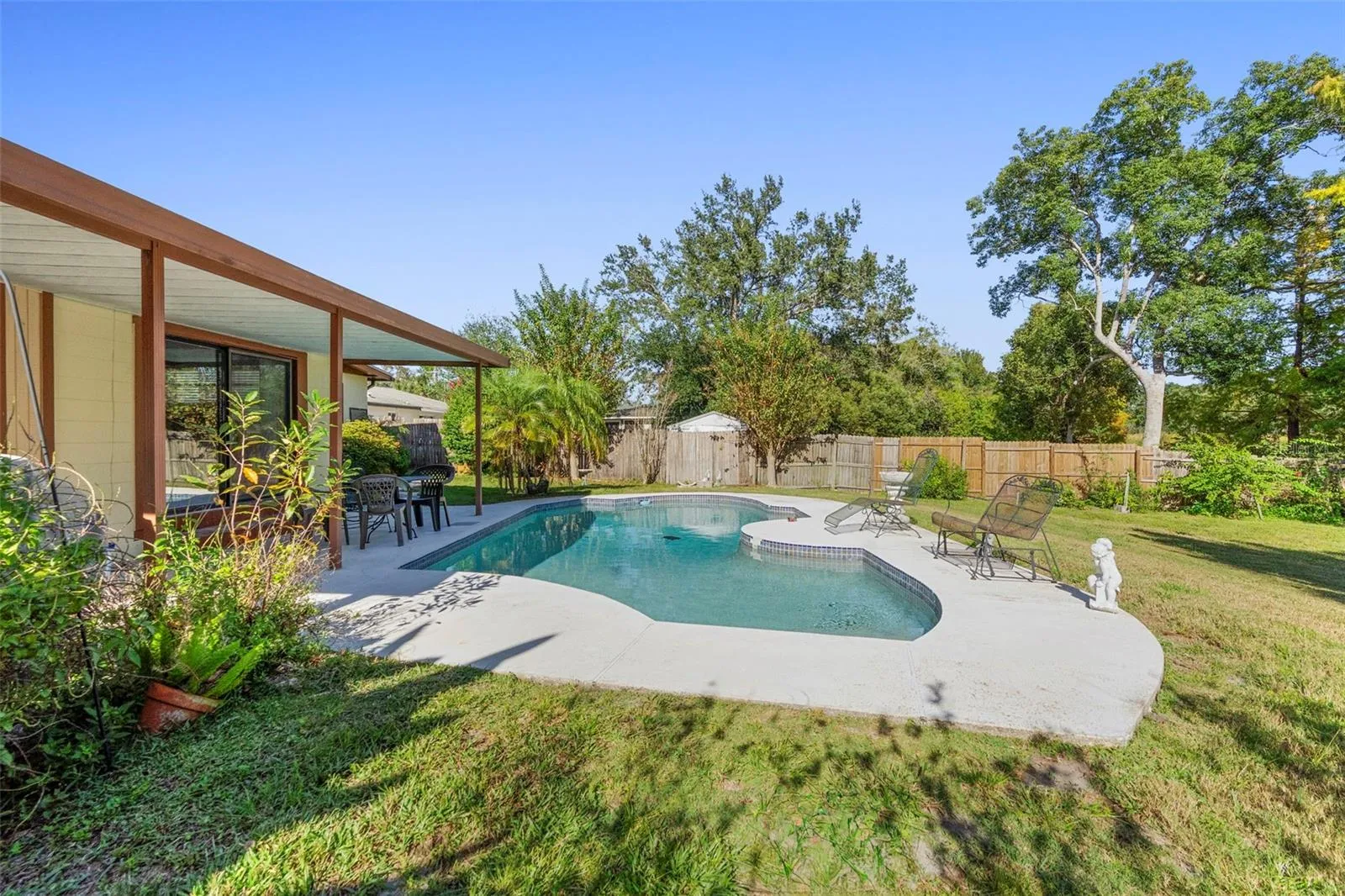 "LongDescription" => "Rear view of the fenced back yard and pool area."