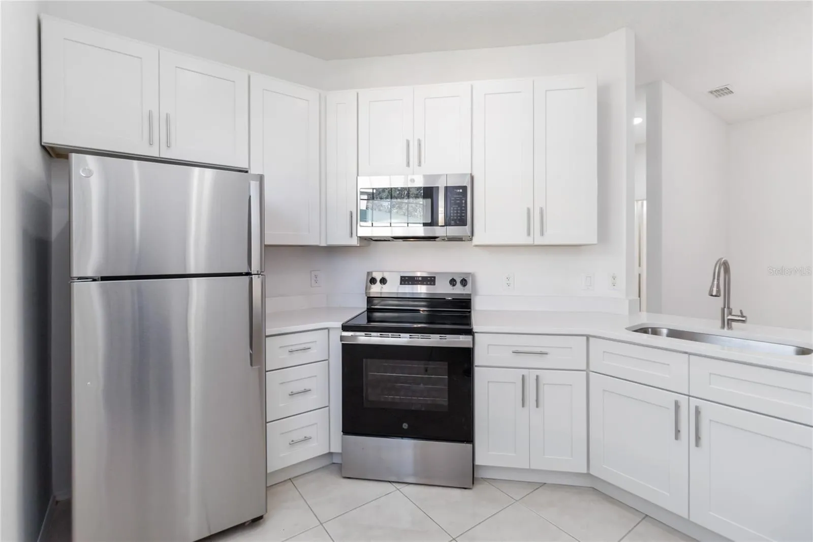 Rare opportunity to own a beautifully remodeled, single-story 3-bedroom 2 bath townhome, perfect for first-time buyers, young families, or those looking to downsize. This move-in-ready home combines modern finishes, functional design, and low-maintenance living in an ideal location. Enjoy porcelain tile flooring throughout the entire home, absolutely NO carpet, creating a clean, cohesive look that is both stylish and easy to maintain. The fully updated kitchen features brand-new soft-close shaker cabinets, elegant quartz countertops, and new stainless steel appliances, offering a fresh, modern space for everyday living and entertaining. The interior has been freshly repainted, enhancing the bright and inviting feel throughout. The private primary suite, located at the rear of the home, includes a walk-in closet and a stunning renovated bathroom with new lighting, modern mirrors, dual sinks, a quartz waterfall vanity, and a sleek cultured marble walk-in shower. The hall bathroom has also been updated with new lighting, a new mirror, a quartz waterfall vanity, and a shower/tub combination. Two additional bedrooms are positioned at the front of the home, ideal for the rest of the family, guests, or a home office. The unit is equipped with a washer and dryer for added convenience. Step outside to the rescreened covered lanai, the perfect space to enjoy morning coffee or unwind with your favorite drink. Ideally located with easy access to Lake Nona, The Loop, Orlando International Airport, as well as shopping, dining, and major travel corridors. Turn-key, single-story townhomes with this level of renovation are a rare find. Don’t wait — schedule your private showing today.