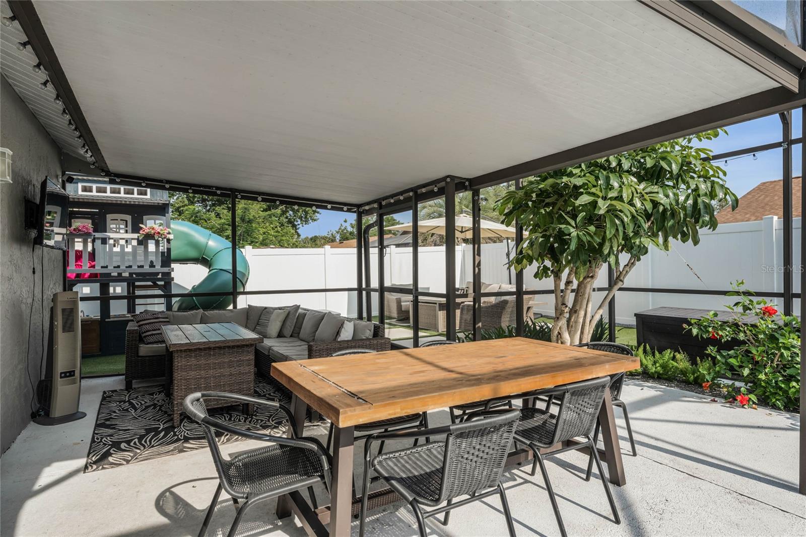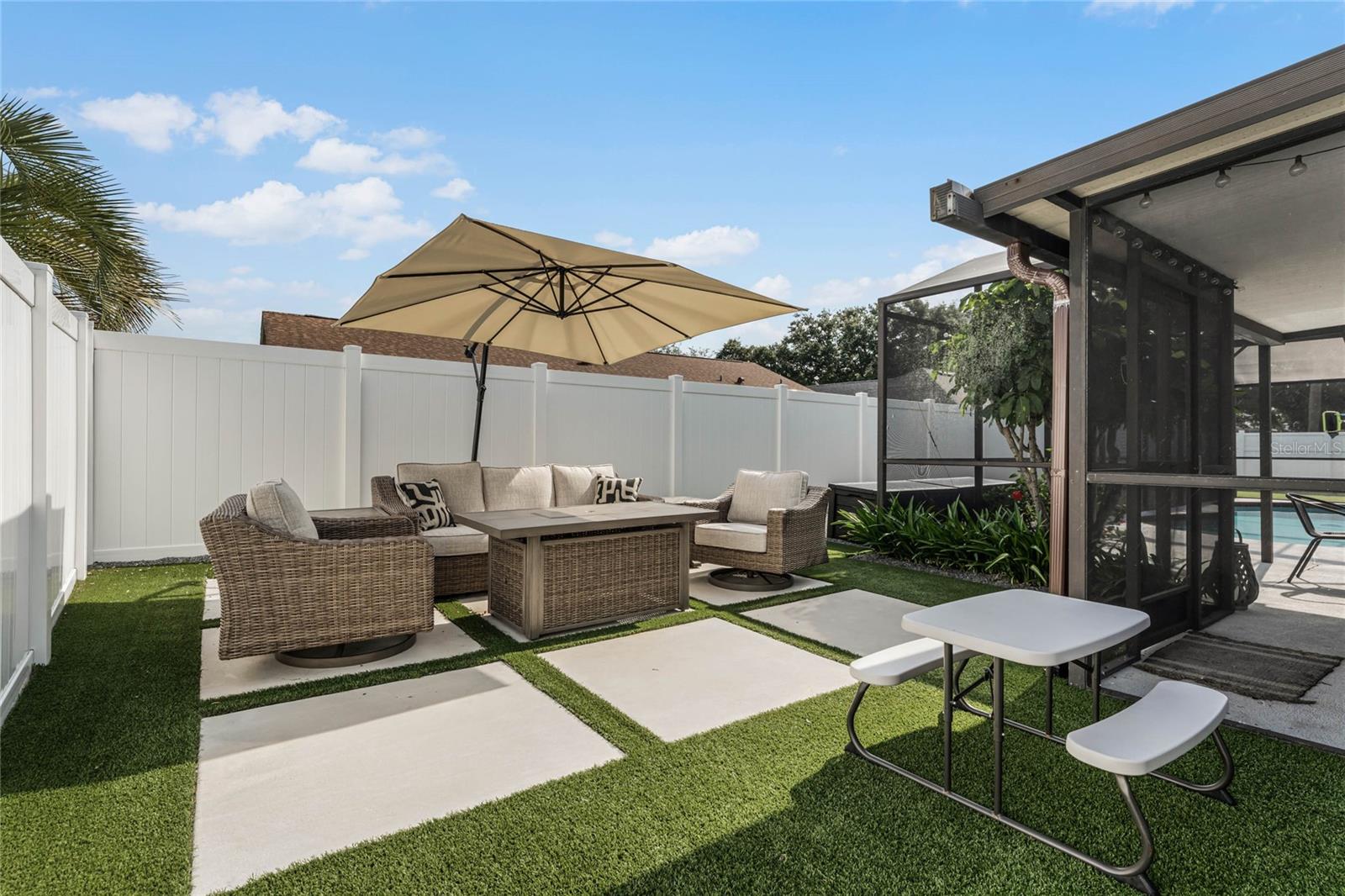 The backyard is a true oasis, featuring a screened-in patio and a fenced-in area surrounding the pool. Take a dip in the pool, relax on the patio, or simply enjoy the privacy and serenity of the landscaped yard.\r\n